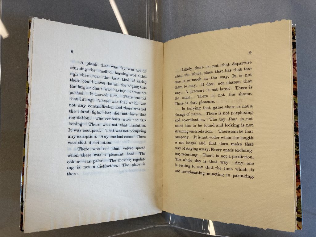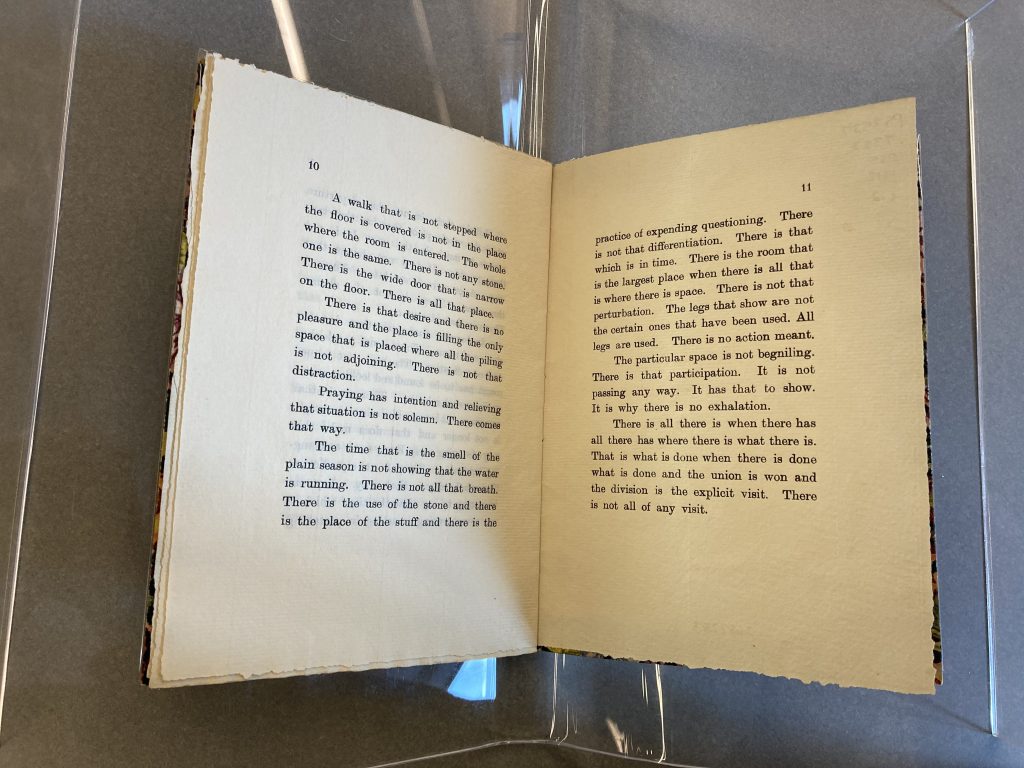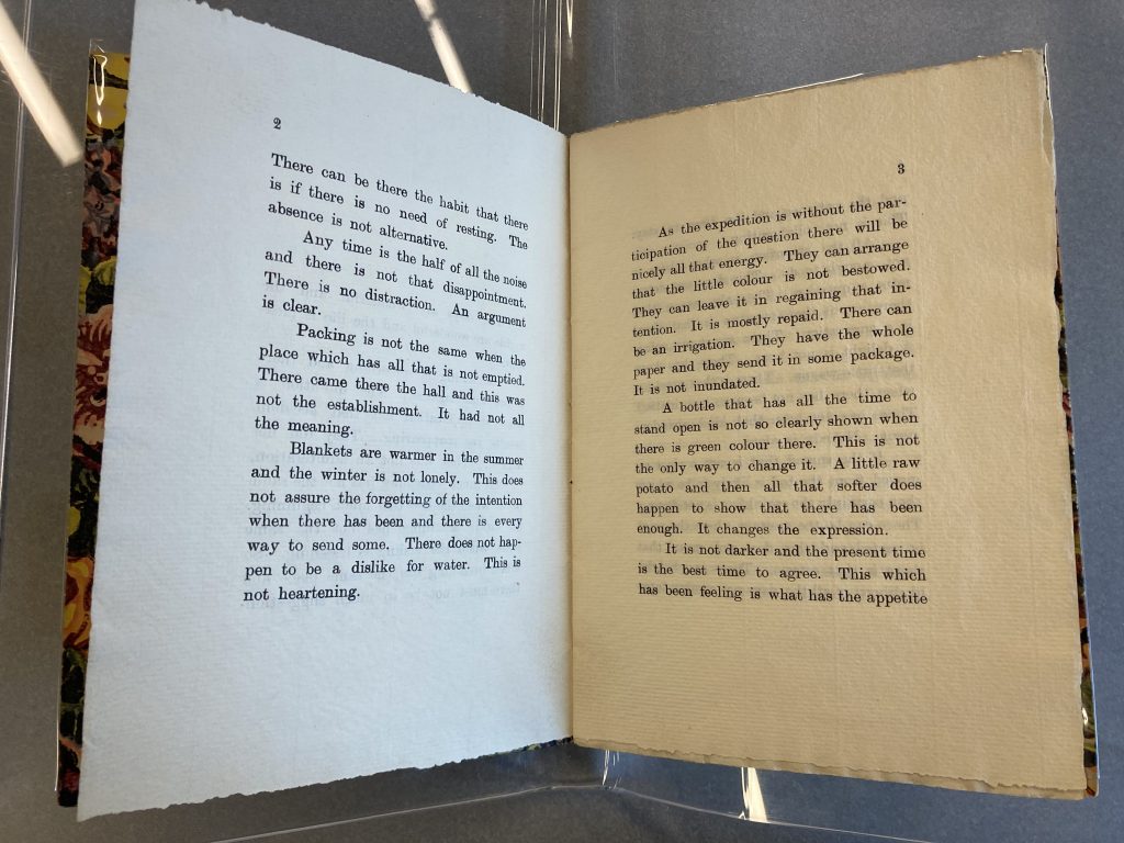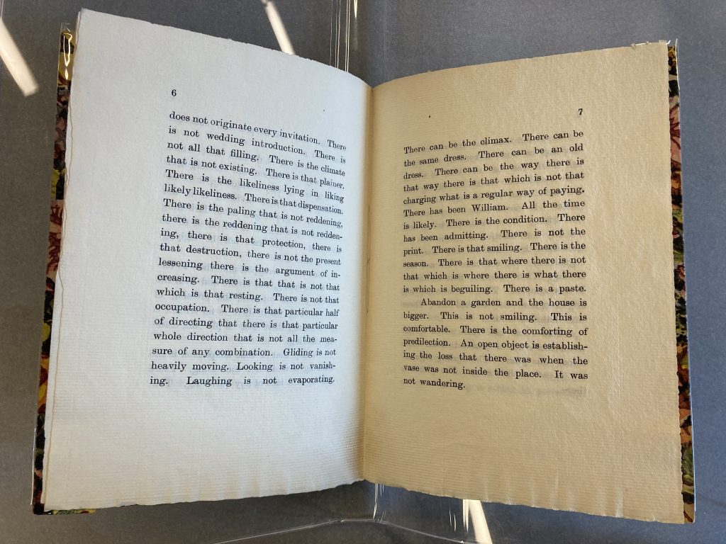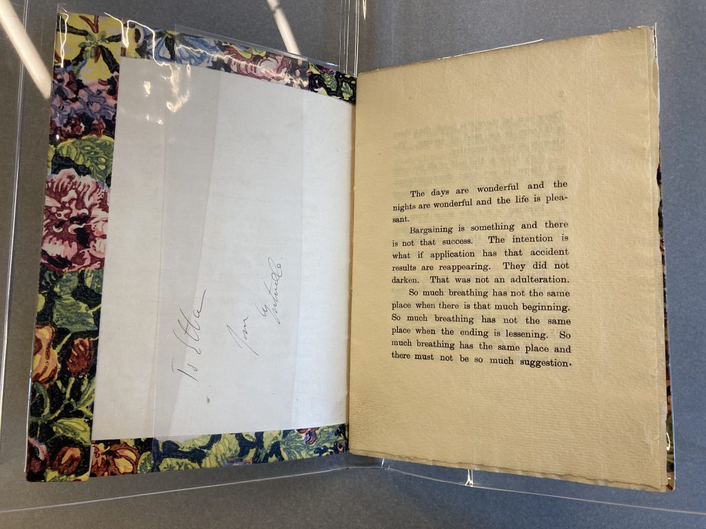 During her visit to Florence in 1911, Gertrude Stein wrote a portrait of Mabel Dodge. Stein often used this “portrait” technique to describe her friends, going beyond just creating an image in words but working to “[produce] a coherent totality through a series of impressions” (Dodge 173). The Portrait of Mabel Dodge at the Villa Curonia focuses on Dodge as she was during a well-known affair with her son’s tutor (Dixon Donnelly), shown through the sensuous tone and suggestive lines Stein included, such as “Abandon a garden and the house is bigger … This is comfortable. There is the comforting of predilection” (Stein 7). Dodge claimed to have a flirtatious relationship with Stein and, in her memoir Movers and Shakers, described their connection, which Toklas severed after that summer (Dixon Donnelly). In early 1912, Dodge moved back to America, and Stein later sent her a copy of the finished portrait filled with little nods to their summer together. Mabel reportedly fell in love with the written portrait and went about getting it published (About Mabel). The small chapbook was privately published in 1912 with Florentine wallpaper for book cloth and 11 pages strictly dedicated to the text with no publisher named or copyright page included. The publication of the portrait as a small book meant, for Stein, that another of her works was published – a dearly held aim; for Dodge, it meant that she could connect her name as an up-and-coming member of the post-Impressionist movement with the name of a well-known collector and modernist figure.