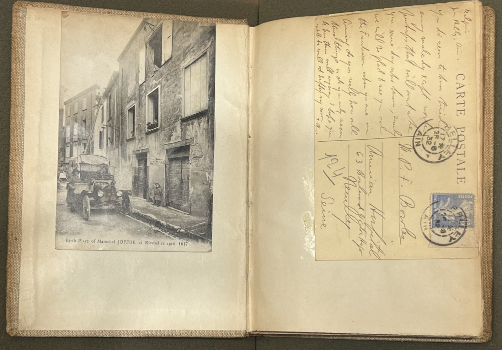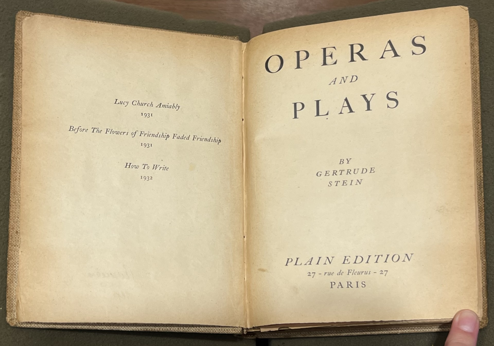 Postcard on front page of Gertrude Stein, Operas and Plays (Dijon: Plain Edition, 1932). From the Sheridan Libraries, Johns Hopkins University. Photograph by Joelie Garcia. (Left).