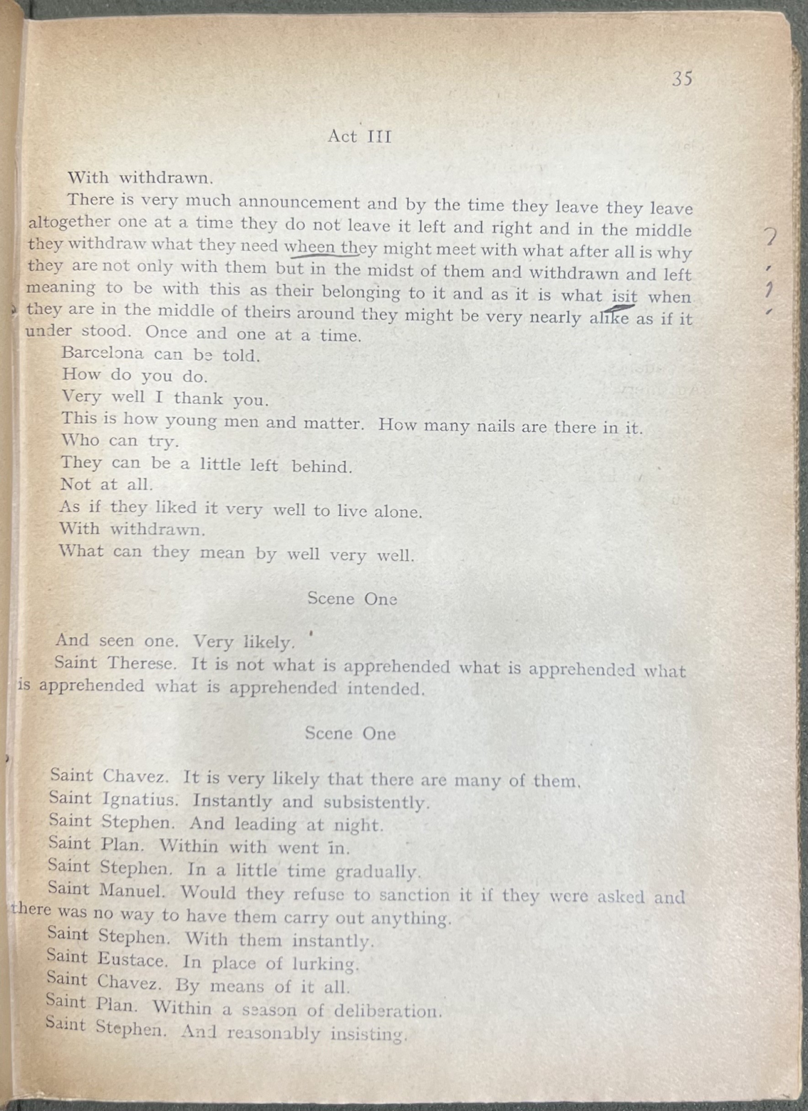 Revisions for Four Saints in Three Acts from Gertrude Stein, Operas and Plays (Dijon: Plain Edition, 1932). From the Sheridan Libraries, Johns Hopkins University. Photograph by Joelie Garcia. (Right).
