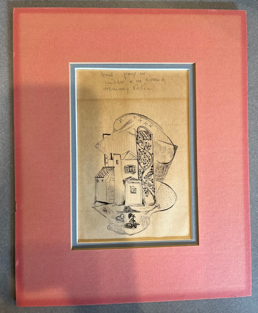 The small sketch in question features a disjointed house with a winding tower of sorts, covered in vines. A butterfly sits next to a leaning flower in the front yard of the house. The scene is spliced together, reminiscent of Picasso’s early experiments with cubism. “Front page or under [] cover of [ordinary] edition” is written in faint pencil at the top. This suggests that there were multiple editions planned following a hierarchy – a deluxe version as well as an ordinary one. The sketch is mounted on a red and blue cardboard frame and backing, the colors faded with age. What do these visual cues tell us about the history of this object that is missing from the archive?