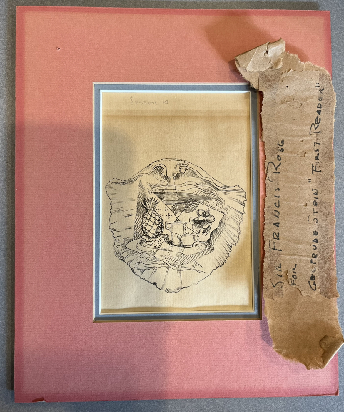 The Beinecke Library’s collection contains correspondence between Toklas and Rose between 1946-1955. These letters are not digitized, so for the moment, I do not know what they might contain. It’s possible that he and Toklas communicated about the publication of the First Reader after Stein’s death and these letters hold clues to the fate of this sketch. Rose also illustrated Toklas’s cookbook, published in 1954, so the correspondence may have focused on that collaboration instead.